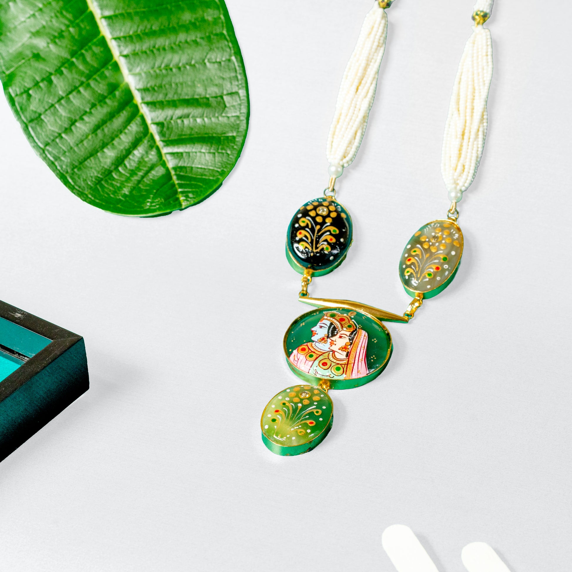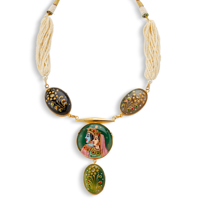 This necklace is more than jewelry—it’s wearable art. Featuring intricate hand-painted meenakari designs inspired by Rajasthani tradition, the necklace is complemented by strands of white beads for a refined touch. Perfect for women who appreciate culture, craftsmanship, and statement accessories that tell a story.